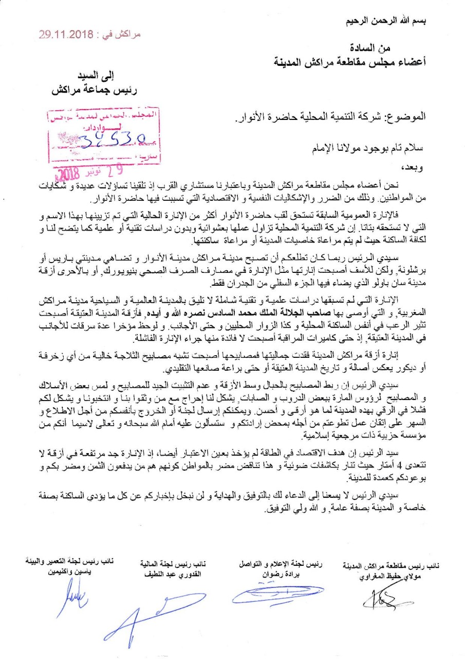 وجه أربعة مستشارين جماعيين بمجلس مقاطعة مراكش المدينة رسالة ـ تتوفر أخبارنا على نسخة منها ـ للعربي بلقايد عمدة المدينة بخصوص شركة التنمية المحلية حاضرة الأنوار، والمكلفة بتدبير ملف الإنارة العمومية بمدينة السبعة رجال.