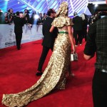 وارتدت لحمامصي التي تعمل أيضا في مجال تقديم البرامج، فستانا ذهبيا من تصميم احدى دور الأزياء المعروفة في العالم، توجد به فتحة طويلة تبرز ساقيها .
