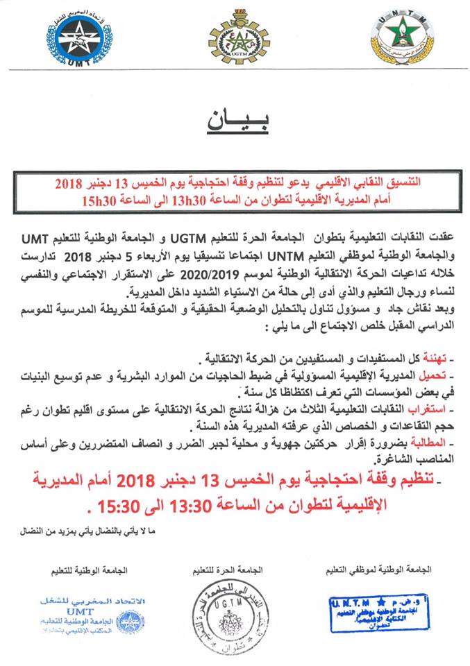 - تنظيم وقفة احتجاجية يوم الخميس 13 دجنبر 2018 أمام المديرية الإقليمية لتطوان من الساعة 13:30 الى 15:30 .