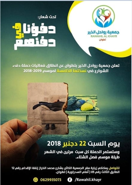 تحت شعار "دفؤنا في دفئهم" تُعلن جمعية "رواحل الخير" بتطوان عن اطلاق فعاليات حملة دفء الشوارع للعناية بالمشردين في نسختها الخامسة لموسم 2018 2019 ، يوم السبت 22 دجنبر 2018 ، وستستمر كل سبت مرتين في الشهر طيلة فصل الشتاء.