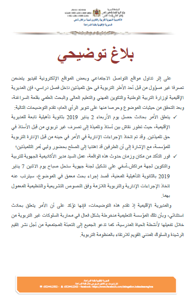 و في توضيح منها، قالت المديرية الاقليمية لوزارة التربية الوطنية والتكوين المهني والتعليم العالي والبحث العلمي بقلعة السراغنة أن الواقعة حدثت يوم الأربعاء 2 يناير 2019 بثانوية تأهيلية تابعة للمديرية الإقليمية.