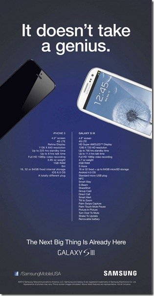 منذ ان أصبحت شركة سامسونج منافس قوي لشركة أبل في مجال صناعة الهواتف ، قامت سامسونج باستهداف أبل في العديد من الإعلانات من بينها هذا الإعلان والذي لاقى استحسان الكثير من المتابعين ، ومع الإعلان عن هاتف الايفون 5 كررت سامسونج نفس الفعله بإطلاق حملة على الصحف الأمريكية تهاجم فيه الأيفون 5 وتوضح ان هناك فارق شاسع بين الايفون 5 و سامسونج جالاكسي اس 3 وكل هذه الفروقات من صالح الأخير وبدأت سامسونج الإعلان بذكر أن الفروقات لا تحتاج لشخص عبقري لمعرفتها واختتم ان الشيء الكبير موجود مسبقا في هاتف الجالاكسي اس 3
