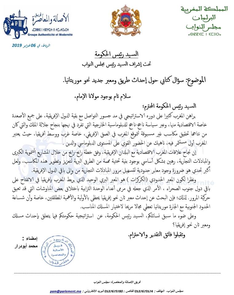 في خضم ما تعيشه المنطقة الحدودية "الكركرات"، المعبر الوحيد الذي يصل المغرب مع باقي دول إفريقيا، من مشاكل واضطرابات، نتيجة ضعف البنية التحتية، علاوة على المناوشات المستمرة لأعداء الوحدة الترابية، وجه نائب لبرلماني عن حزب الأصالة والمعاصرة، سؤالا كتابيا إلى السيد رئيس الحكومة، تساءل خلاله عن استراتيجية الحكومة فيما يخص إحداث معبر ثان لربط المغرب بموريتانيا ومن خلالها إلى باقي دول إفريقيا.