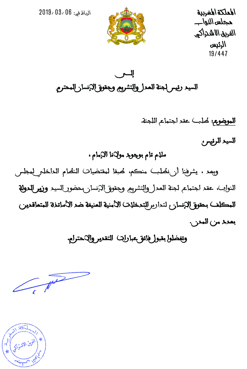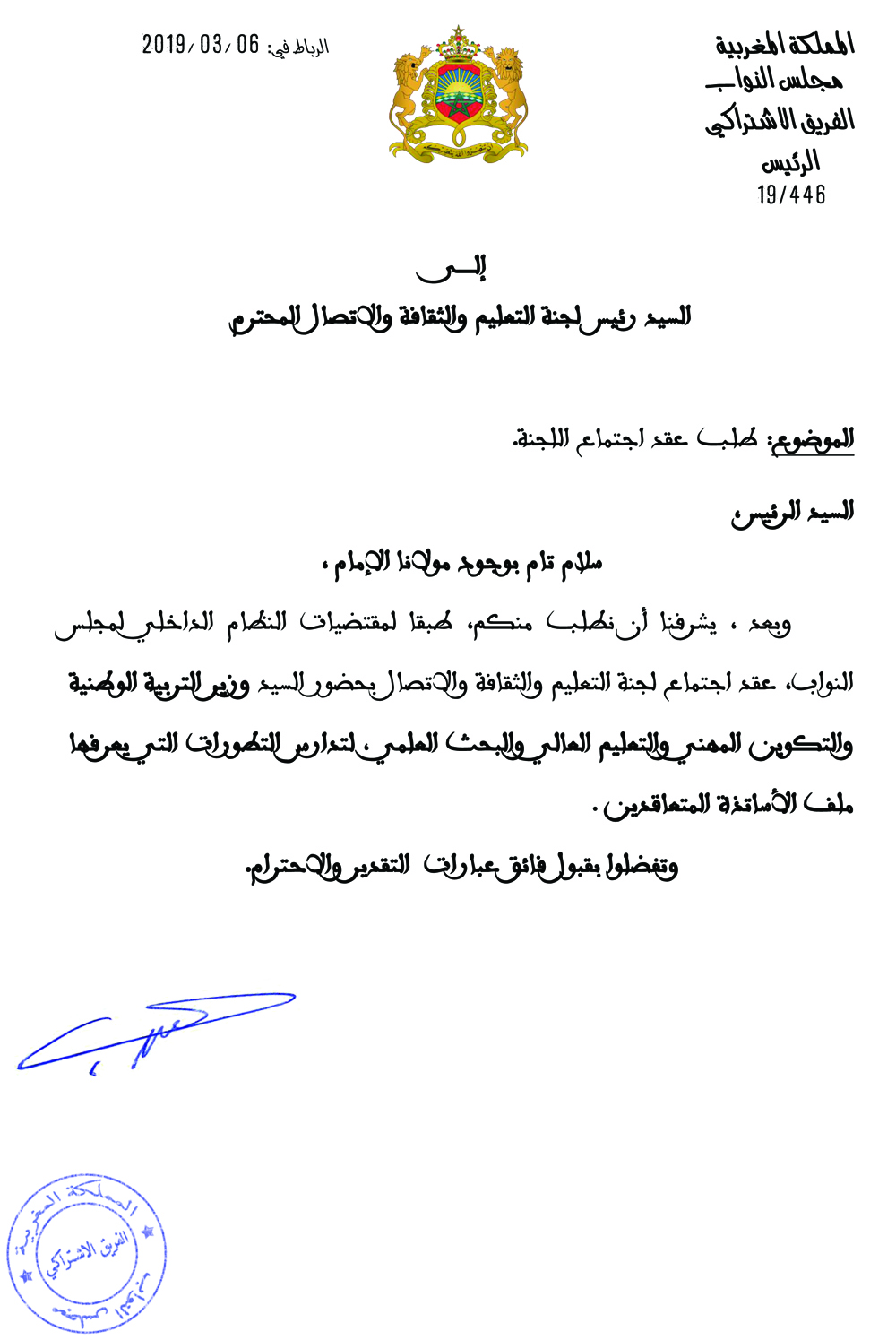 وفي سياق متصل، راسل الفريق الإشتراكي كذلك رئيس لجنة التعليم والثقافة والإتصال، وطالب الفريق بعقد اجتماع اللجنة، حول نفس الموضوع.