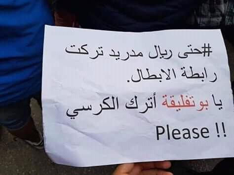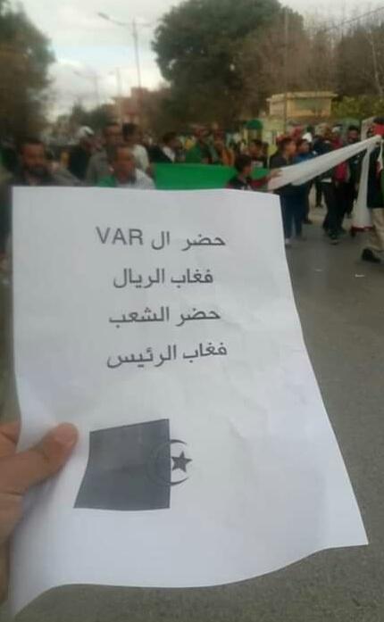 وحمل جزائريون لافتات كُتب عليها عبارات من قبيل "ريال مدريد طاح ونتوما مازلتو لاصقين"، و"يا بوتفليقة حنا ماشي الريال باش نروحوا بـ5.. لا للخامسة"، و"حتى ريال مدريد تركت رابطة الأبطال. يا بوتفليقة اترك الكرسي"