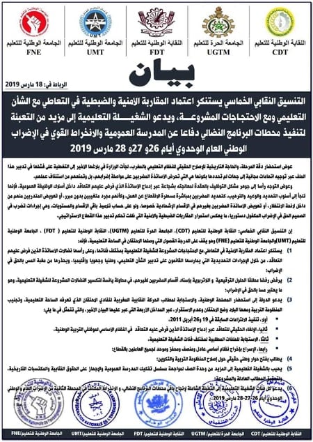 استنكر التنسيق النقابي الخماسي بقطاع التعليم ( CDT و UGTM و FDT و UMT و FNE )، "اعتماد المقاربة الأمنية والضبطية في التعاطي مع الشأن التعليمي ومع الاحتجاجات المشروعة"، وفق تعبيره .