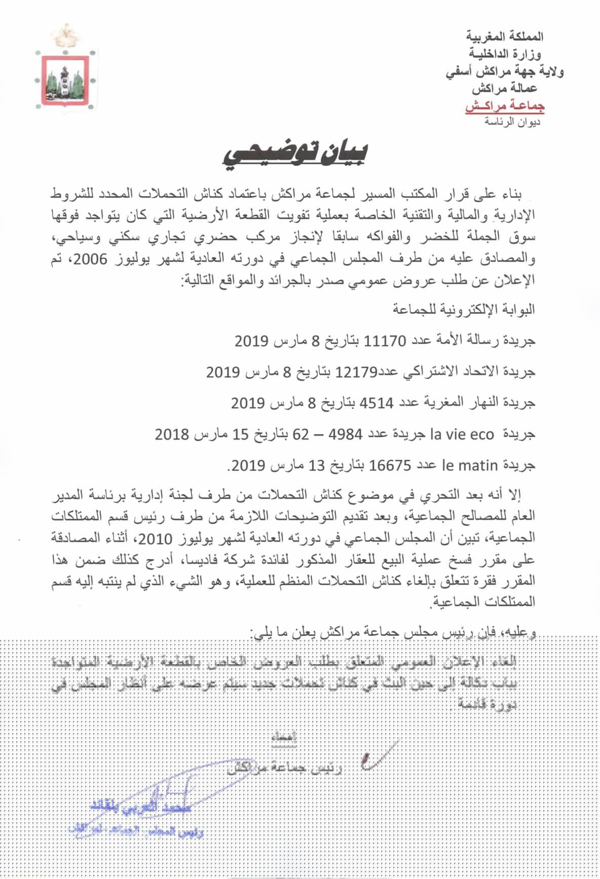 مباشرة بعد مقال لأخبارنا المغربية في 18 من هذا الشهر، والذي حمل عنوان: "حسي مسي: عمدة مراكش يعرض بقعة جماعية للبيع بالملايير ومنتخبون يحتجون"، سارع المجلس الجماعي لمراكش الذي يترأسه البيجيدي محمد العربي بلقايد إلى إلغاء طلب العروض الخاص ببيع البقعة الأرضية المتواجدة بباب دكالة إلى حين البث في كناش تحملات جديد كما ورد في بيان توضيحي صدر بالمناسبة، متحدثا عن "عدم انتباه" قسم الممتلكات بالجماعة "يا حسرة"، إلى فقرة بقرار إلغاء عملية بيع سابقة للعقار المذكور تمت في 2010، ونصت على إلغاء كناش التحملات المنظم لعملية البيع، ما يعني ضرورة بث المجلس في كناش تحملات جديد.