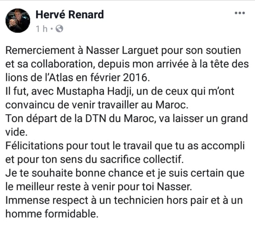 عقب إقدام الجامعة الملكية لكرة القدم على إقالة المدير التقني الوطني ناصر لارغيت، بادر الناخب الوطني السيد هيرفي رونار، إلى بعث رسالة شكر إلى الإطار الوطني المقال، ضمنها بتدوينة نشرها عبر حسابه الفيسبوكي.