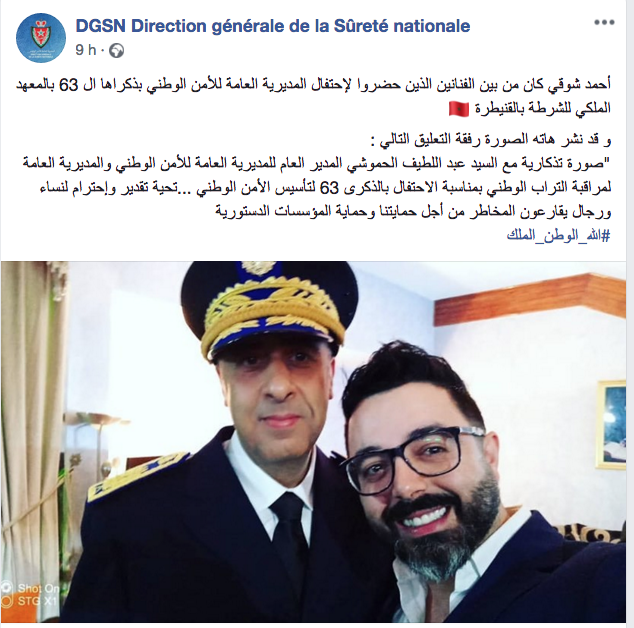 وقالت المديرية في تعليق مرافق للصورة أن "أحمد شوقي كان من بين الفنانين الذين حضروا لإحتفال المديرية العامة للأمن الوطني بذكراها ال 63 بالمعهد الملكي للشرطة بالقنيطرة".