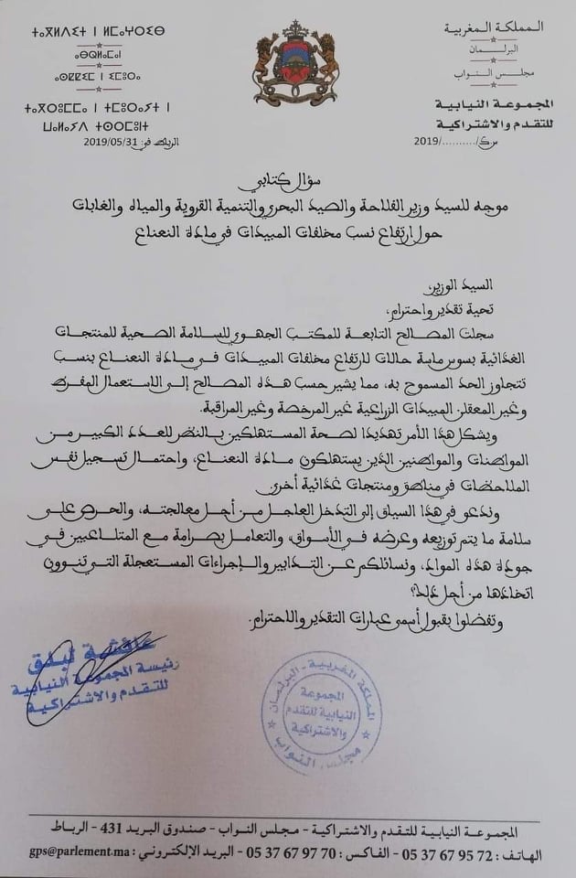وفي ختام السؤال، دعت النائبة البرلمانية، وزير الفلاحة إلى التدخل العاجل من أجل معالجة هذا الأمر، والحرص على سلامة ما يتم توزيعه وعرضه في الأسواق، والتعامل بصرامة مع المتلاعبين في جودة هذه المواد، خاتمة كلامها بالقول "ونسائلكم عن التدابير والإجراءات المستعجلة التي تنوون اتخاذها من أجل ذلك".