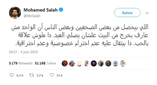 وغرد صلاح على حسابه في تويتر قائلا: "اللي بيحصل من بعض الصحفيين وبعض الناس أن الواحد مش عارف يخرج من البيت علشان يصلي العيد. دا ملوش علاقة بالحب. دا بيتقال عليه عدم احترام خصوصية وعدم احترافية".