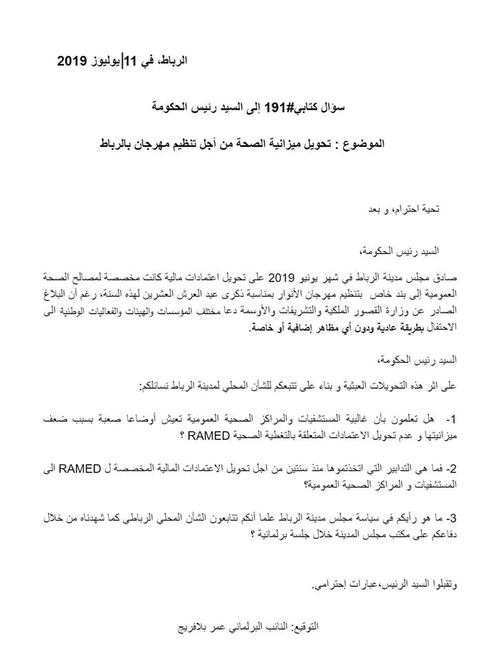 وجه النائب البرلماني عمر بلافريج عن "فيدرالية اليسار الديمقراطي" سؤالا كتابيا إلى رئيس الحكومة بخصوص تحويل ميزانية مخصصة لمصالح الصحة من أجل تنظيم مهرجان بالرباط.