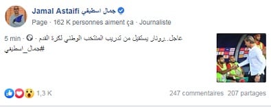 نشر الصحافي الرياضي المعروف جمال اسطيفي، رئيس تحرير "المساء الرياضي"، قبل قليل تدوينة على حسابه الفايسبوكي يؤكد فيها أن الناخب الوطني هيرفي رونار قد قدم استقالته إلى فوزي لقجع.