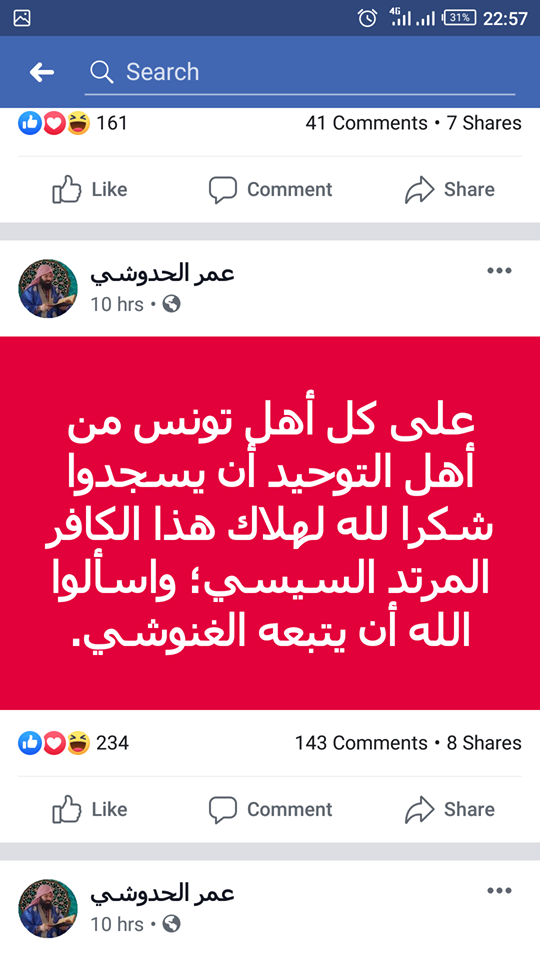 وقال الحدوشي في تدوينة على الفايسبوك "على كل أهل تونس من أهل التوحيد أن يسجدوا شكرا لله لهلاك هذا الكافر المرتد السبسي؛ واسألوا الله أن يتبعه الغنوشي".