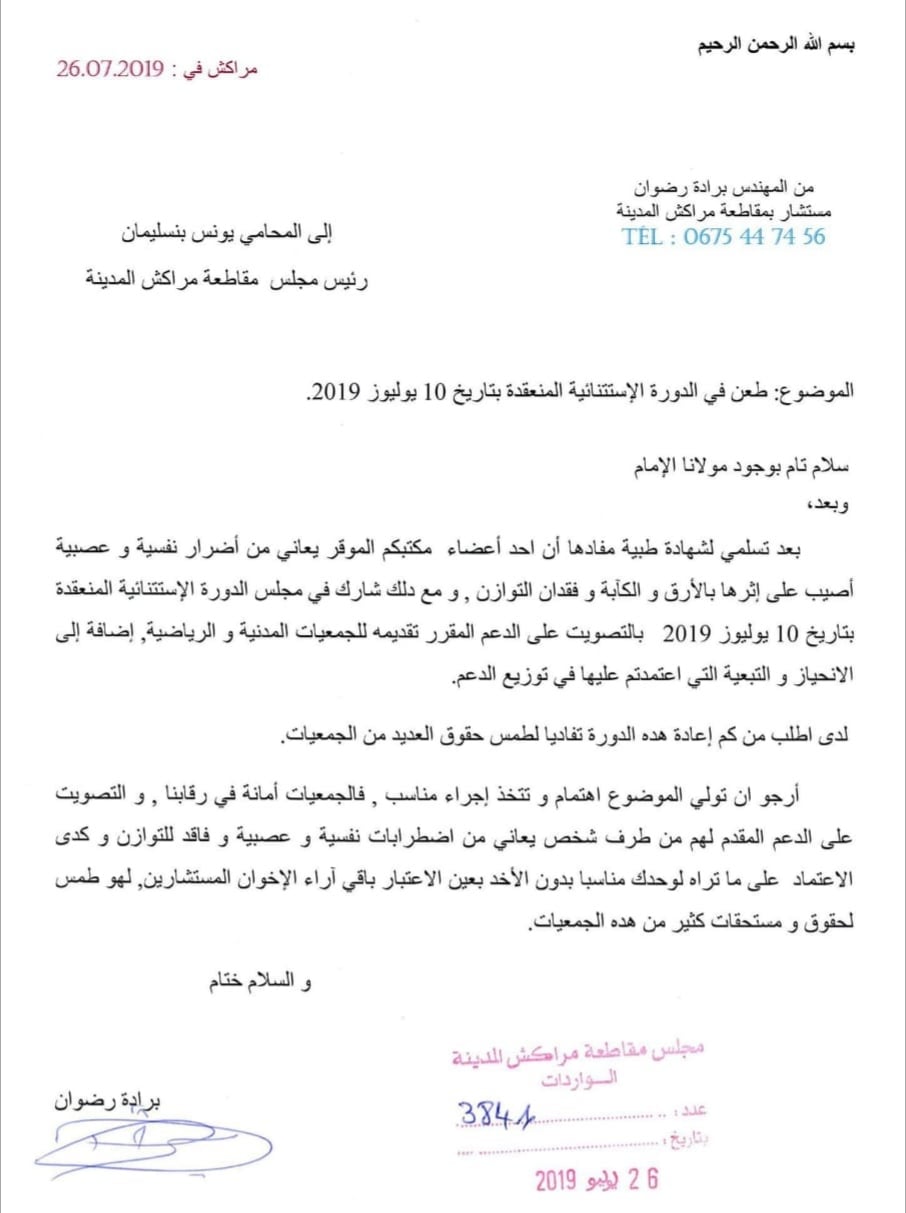 سارع برادة رضوان رئيس لجنة التواصل والإعلام بمجلس مقاطعة مراكش المدينة للطعن في نتائج الدورة الإستثنائية للمجلس والتي انعقدت في 10 من هذا الشهر، وذلك استنادا على اطلاعه على شهادة طبية تفيد إصابة عضو مكتب المجلس، والذي شارك في أشغال الدورة المشار إليها وصوت على الدعم المقدم للجمعيات من المال العام، بأضرار نفسية وعصبية أصيب على إثرها بالأرق والكآبة وفقدان التوازن...
