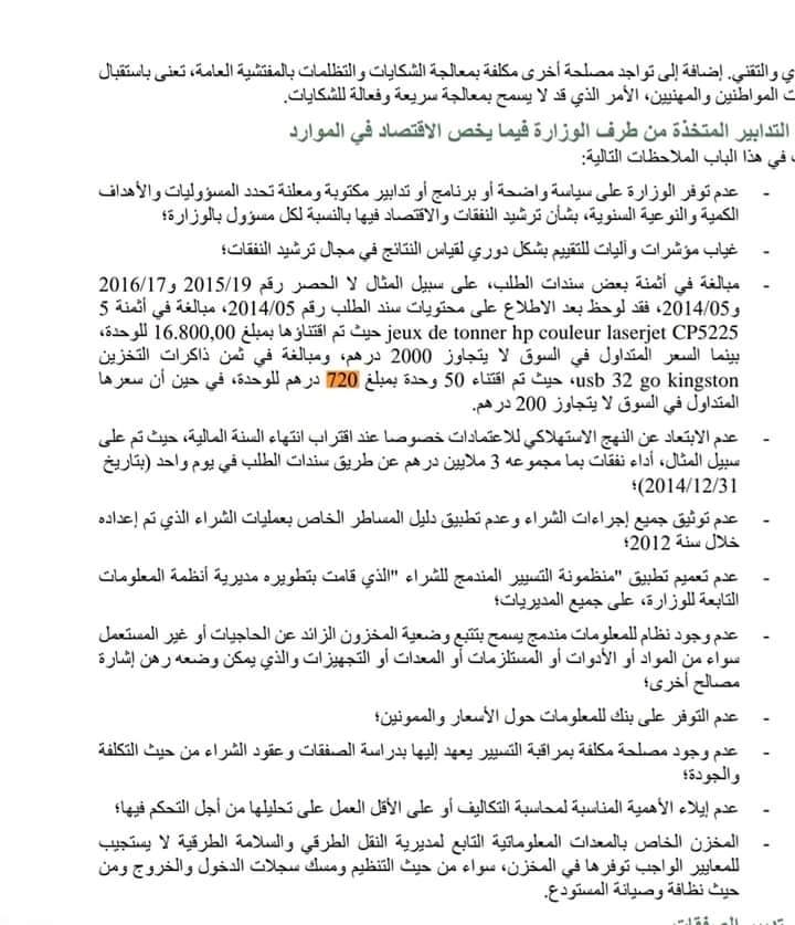 وآخذ تقرير المجلس عدم توفر وزارة اعمارة على سياسة أو تدابير مكتوبة ومعلنة تحدد المسؤوليات والأهداف الكمية والنوعية السنوية، بشأن ترشيد النفقات والاقتصاد فيها بالنسبة لكل مسؤول بالوزارة، وغياب مؤشرات وآليات للتقييم بشكل دوري لقياس النتائج في مجال ترشيد النفقات، ووقف التقرير على نماذج حية للإختلال والمبالغة في التسعيرة كاقتناء الوزارة لمداد خاص بالطابعات لا يتجاوز سعره في السوق 2000 درهم بثمن يقارب 17 ألف درهم، واقتناء 50 وحدة حاملة للبيانات ” USB” لا يتجاوز سعر الواحدة في السوق 200 درهم بـ720 درهم للوحدة.