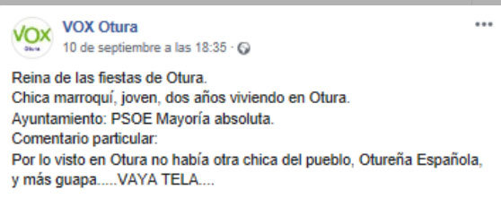 وجاء في التدوينة أنه "تم تتويج فتاة مغربية لم يمر سوى عامين على قدومها إلى أوتورا، وكأنه لا توجد فتاة إسبانية أجمل منها في المنطقة"، وفق تعبير التدوينة .