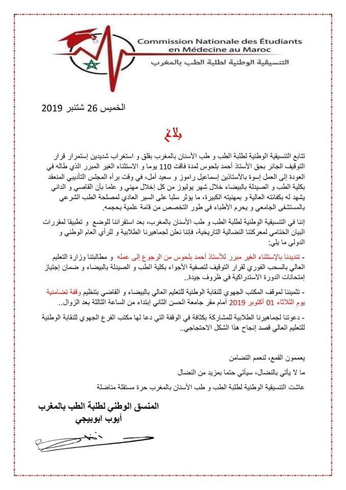 وتطالب التنسيقية وزارة التعليم العالي بسحب القرار الصادر في حق الأستاذ لتصفية الأجواء بكلية الطب والصيدلة وضمان اجتياز امتحانات الدورة الاستدراكية في ظروف جيدة، وفق تعبير البلاغ.