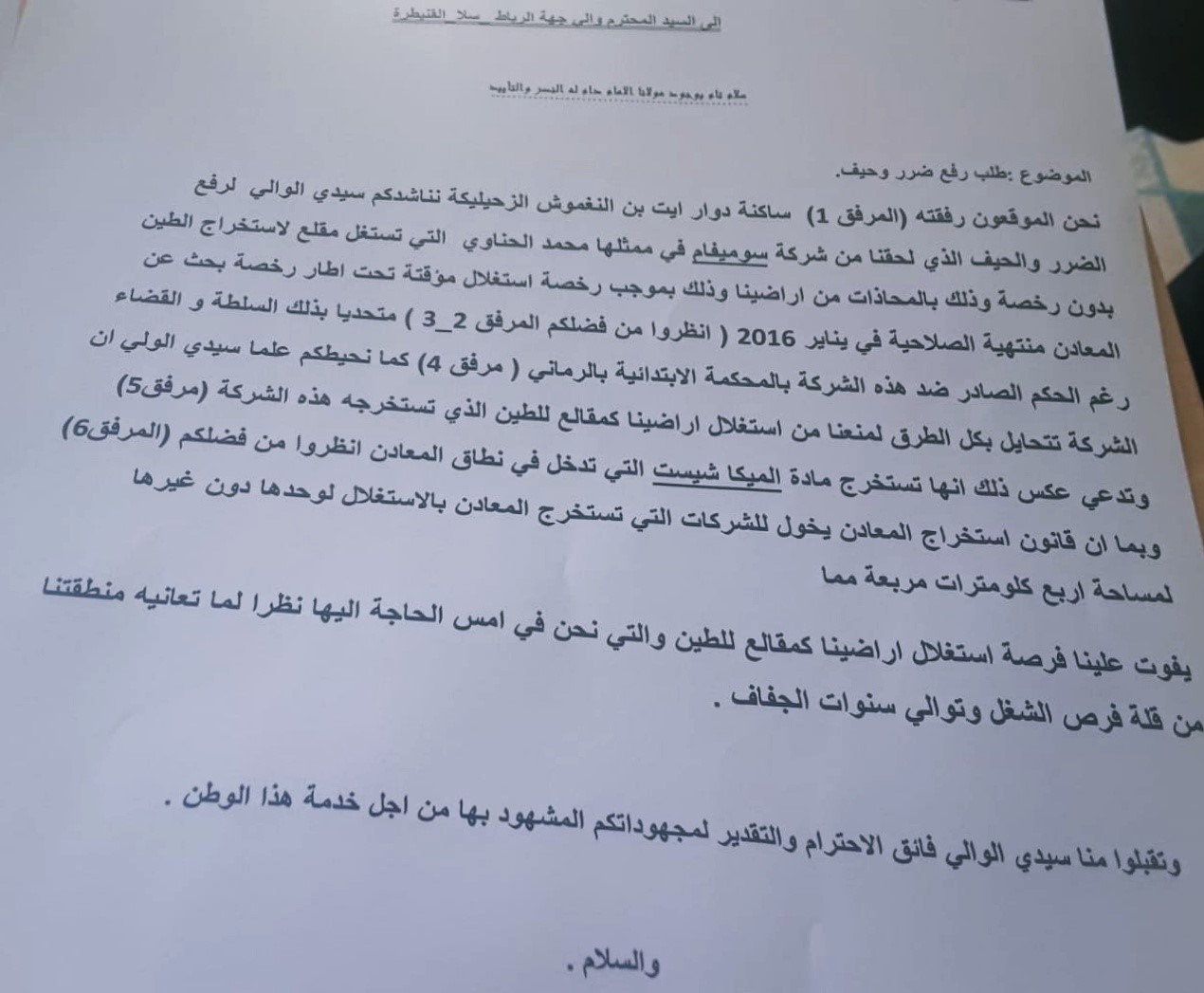لأجل كل ما جرى ذكره، رفع سكان المنطقة المتضررين عريضة جديدة إلى السيد والي جهة الرباط سلا القنيطرة، من وضع حد لهذه المعاناة، سيما في ظل المخاطر البيئية التي تتسبب فيها الشركة المشتكى بها، تحايلها على القانون لمنع استثمارات ستساهم لا محالة في الحد من تفشي البطالة بين شباب المنطقة.