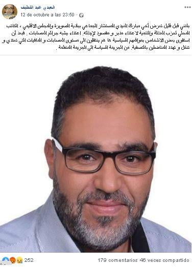 وقال المتحدث في صفحته على الفايسبوك "بلغني قبل قليل تعرض أخي مبارك العيدي المستشار الجماعي ببلدية الصويرة والمجلس الاقليمي ، الكاتب المحلي لحزب العدالة والتنمية لاعتداء مدبر و مقصود لإيدائه. اعتداء يشبه جرائم العصابات".