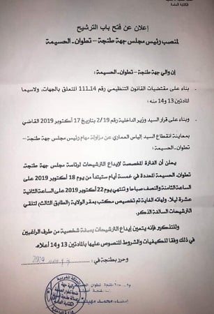 وجاء في المذكرة أنه تبعا لقرار وزير الداخلية رقم 19/2 بتاريخ 17 أكتوبر 2019 القاضي بمعاينة انقطاع السيد إلياس العماري عن مزاولة مهام رئيس مجلس جهة طنجة - تطوان - الحسيمة، وطبقا لمقتضيات القانون التنظيمي رقم 14-111 المتعلق بالجهات فقد تم الإعلان عن الفترة المخصصة لإيداع الترشيحات لرئاسة مجلس جهة طنجة - تطوان - الحسيمة المحددة في خمسة أيام.