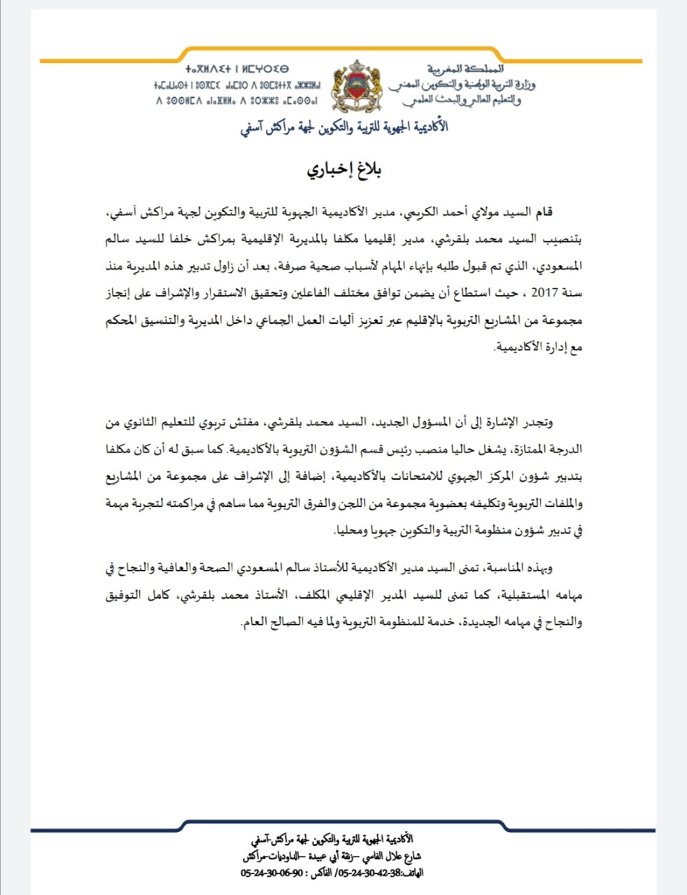 توصلت أخبارنا المغربية ببلاغ من الأكاديمية الجهوية للتربية والتكوين بجهة مراكش آسفي يفيد إعفاء مديرها م احمد لكريمي لسالم المسعودي من مهامه على رأس المديرية الإقليمية للتعليم بمراكش، وذلك استجابة لطلبه والراجع وفقا للبلاغ لأسباب صحية صرفة، فيما تم تكليف رئيس قسم الشؤون التربوية بالأكاديمية محمد بلقرشي بتسيير المديرية المذكورة في انتظار تعيين مدير جديد لها.