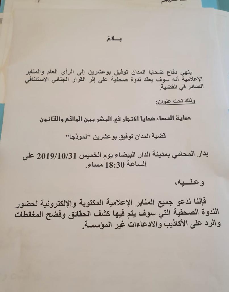 للإشارة فالندوة الصحافية المذكورة، تنظم تحت عنوان:"حماية النساء ضحايا الإتجار في البشر بين الواقع والقانون قضية المدان توفيق بوعشرين نموذجا".