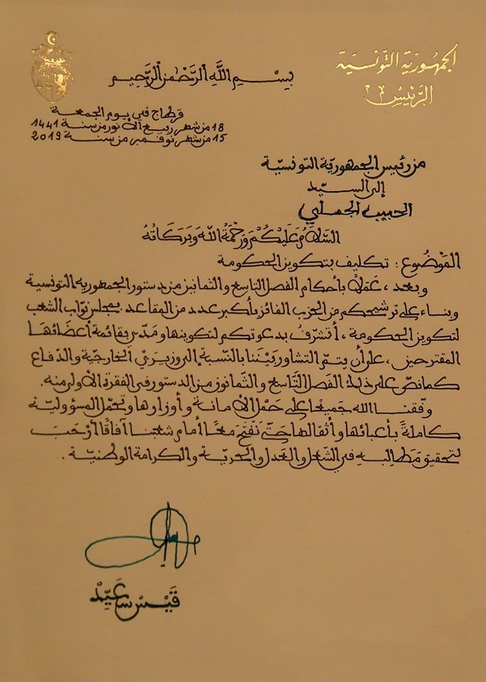 اختار الرئيس التونسي، قيس سعيد، أن يخط بيده رسالة التكليف بتشكيل الحكومة لمرشح حزب حركة النهضة، الحبيب الجملي، في خطوة غير مسبوقة.