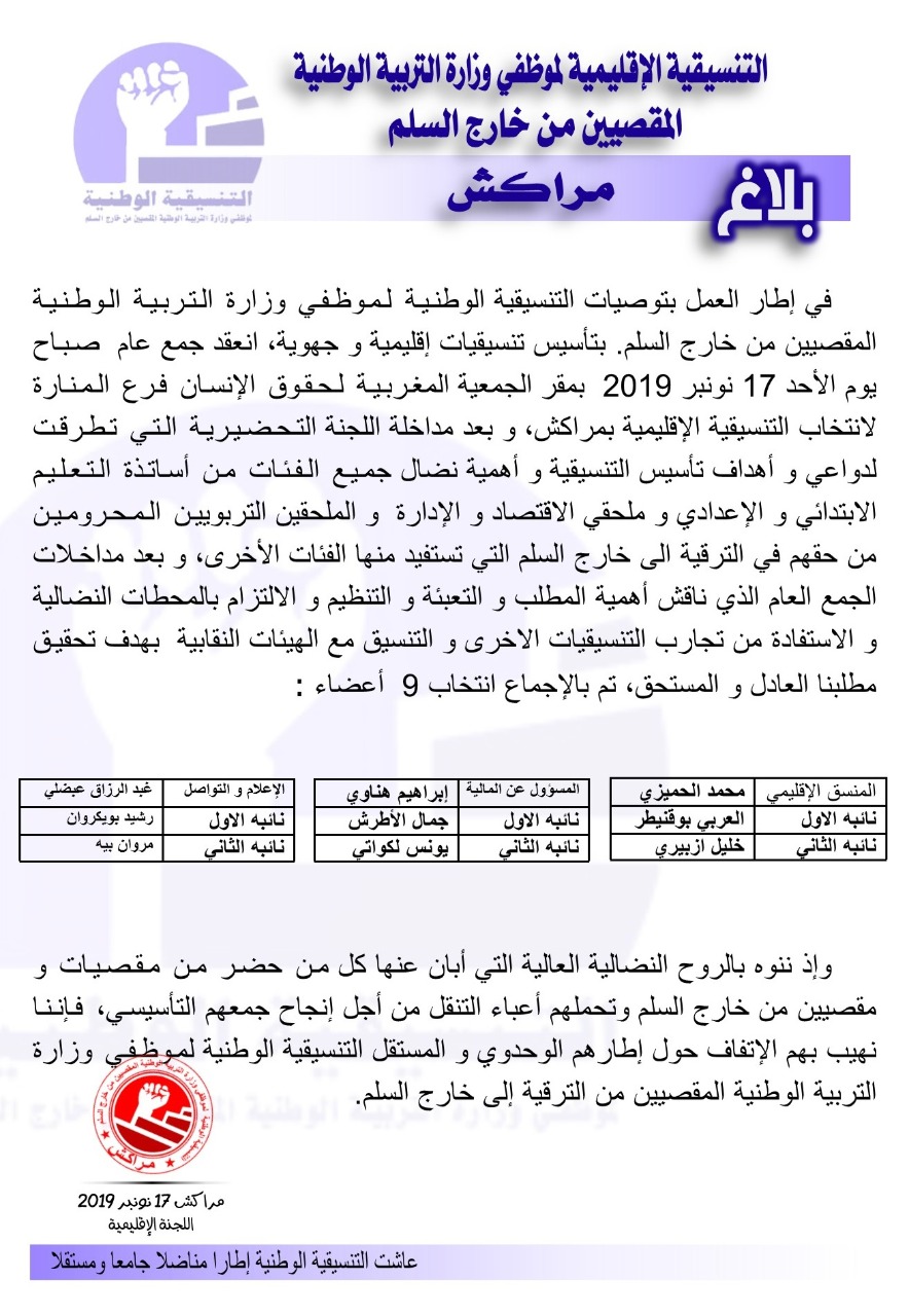 وكان بيان تأسيسي للتنسيقية الوطنية لموظفي وزارة التربية الوطنية المقصيين من خارج السلم، والتي انعقدت في 28 أكتوبر الماضي بالرباط، قد أكد أن الإطار الجديد سيشكل فضاء للنضال من أجل رفع التمييز والإقصاء الذي عانت منه فئات من موظفي القطاع، معلنا عن تشكيل مجلس وطني سيقرر في كل ما يتعلق بالتنسيقية بعد رفع التوصيات والمقترحات عن المجموعات الإقليمية، ولجنة وطنية تلعب دور هيئة تنفيذية للمقررات المجلس.