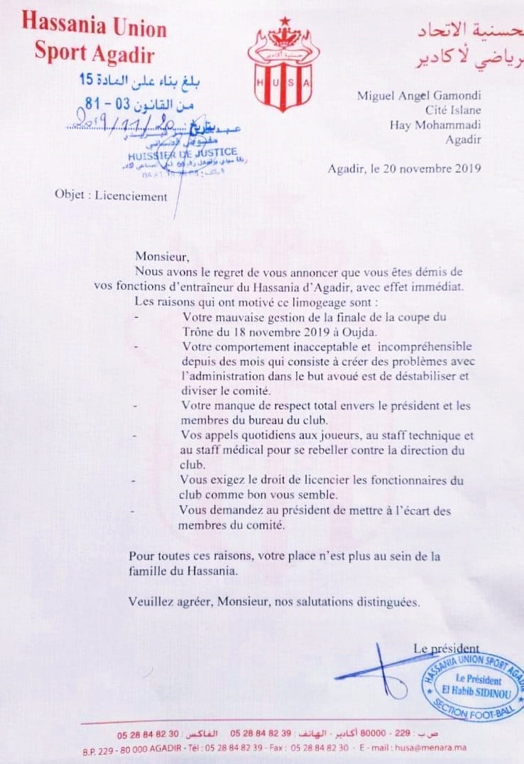 المثير في الموضوع، أن المكتب المسير للحسنية، وبدل أن يفك ارتباطه بالمدرب الذي قاد الفريق إلى تحقيق نتائج مهمة جدا، اختار أن يسلك أسلوب "الهروب" إلى الأمام، حيث وجه إلى "غاموندي" سيلا من "التهم" المثيرة جدا، تضمنتها وثيقة الإقالة التي توصل بها موقع "أخبارنا"، ضمنها عدم احترام الرئيس وباقي أعضاء المكتب المسير، وتحريض اللاعبين على المكتب المسير.. (الوثيقة):