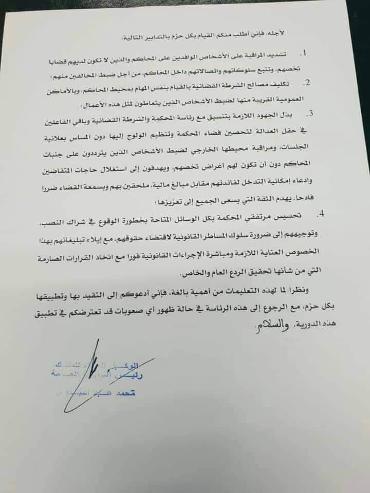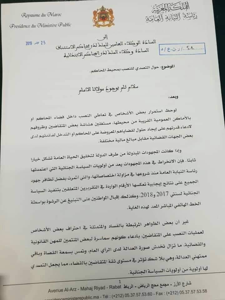 وجه رئيس النيابة العامة محمد عبد النباوي، مذكرة إلى الوكلاء العامين للملك لدى محاكم الاستئناف، وكلاء الملك لدى المحاكم الابتدائية، حول "التصدي للنصب بمحيط المحاكم".