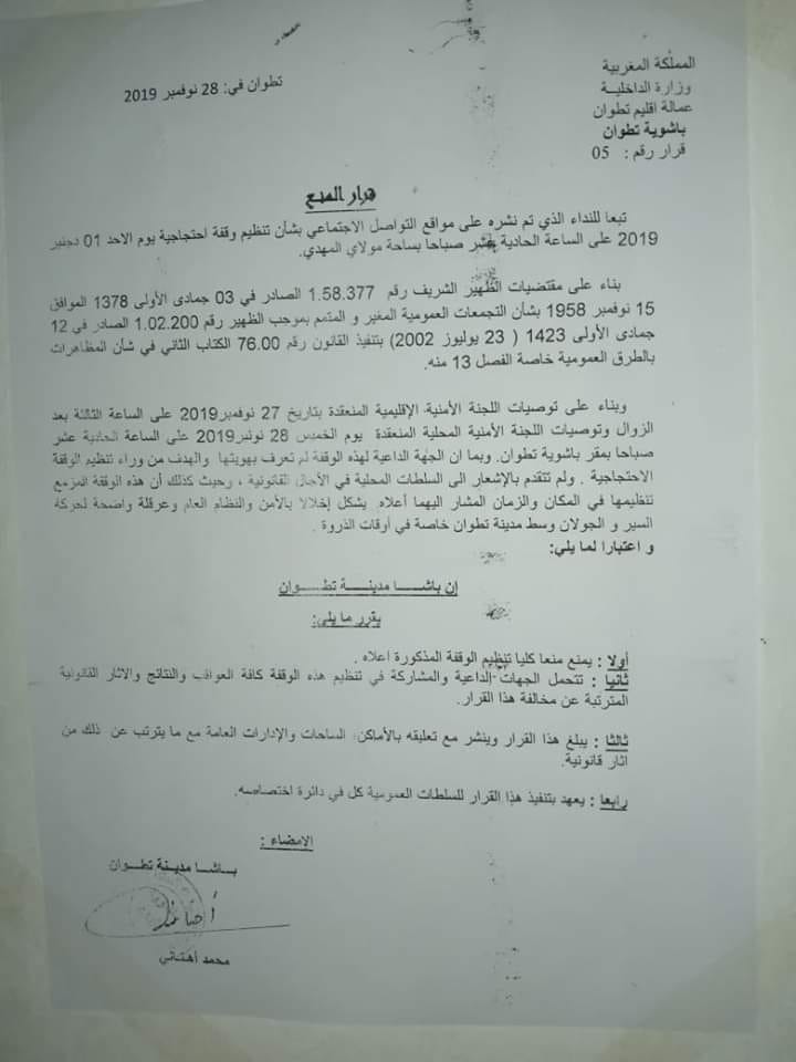 وأكد باشا تطوان في القرار أنه يمنع كليا تنظيم هذه الوقفة، معتبرا أن المنادين للوقفة الاحتجاجية، لم يقدموا إشعارا للسلطات العمومية في الآجال القانونية المنصوص عليها في قانون الحريات العامة.