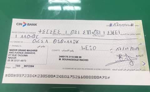 ونشر المتحدث على صفتحه بالفايسبوك صورة الشيك ، معلقا عليها "رشيد بوهدوز مواطن مغربي ينحدر من مدينة الناظور يقوم بكتابة معلوماته في الشيك بحرف تيفيناغ..!!".