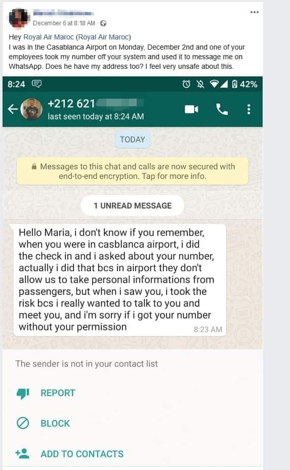 المعنية بالأمر المدعوة "ماريا" قالت في تدوينة بالفايسبوك، موجهة لشركة "لارام": "كنت بمطار الدار البيضاء يوم الاثنين 2 دجنبر، وأحد موظفيك أخذ رقم هاتفي من قاعدة البيانات وبعث لي رسالة عبر الواتساب".