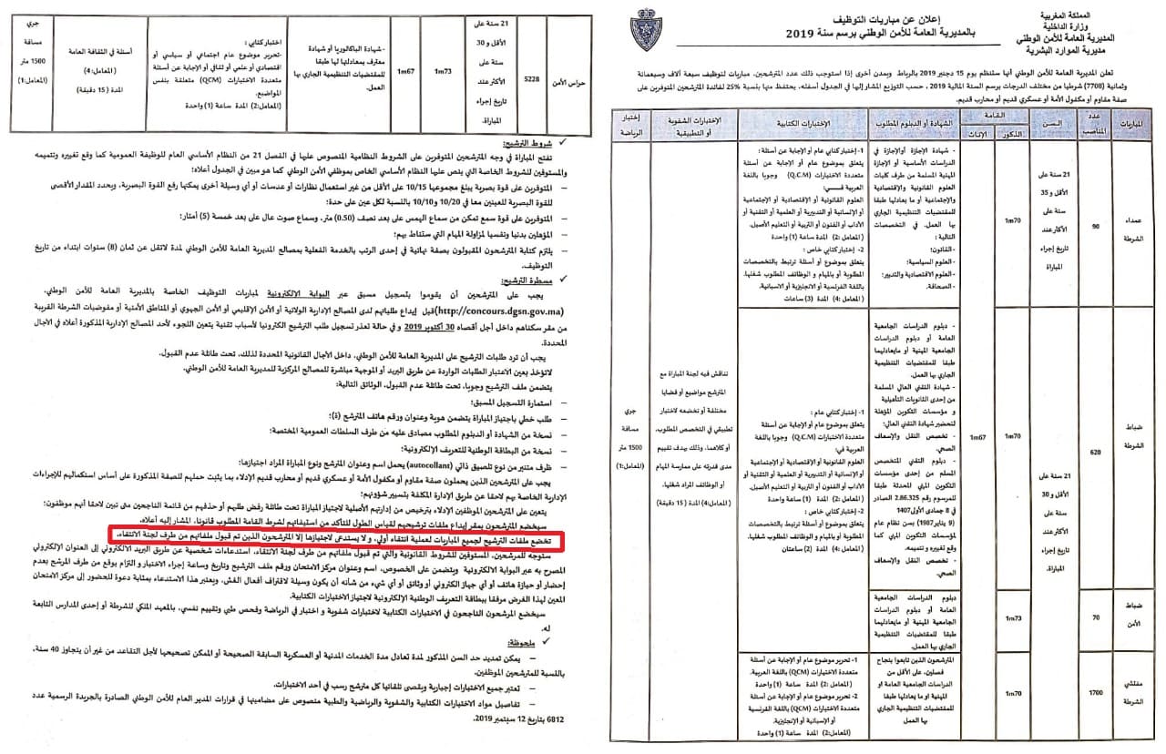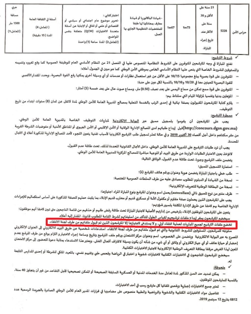 واستطرد ذات المصدر، بأن المديرية العامة للأمن الوطني أعلنت بشكل صريح وواضح عن هذا المقتضى التنظيمي في "إعلان المباريات" المنشور في المواقع الإخبارية على شبكة الأنترنت وفي الجرائد الوطنية المكتوبة، وفي الموقع الرسمي للإدارة العمومية الوطنية، وكذا في الحساب الرسمي للمديرية العامة للأمن الوطني على موقع تويتر. وأن هذا الإعلان تم نشره بتاريخ 17 أكتوبر 2019 أي قبل الموعد المحدد للمباريات بحوالي شهرين تقريبا.