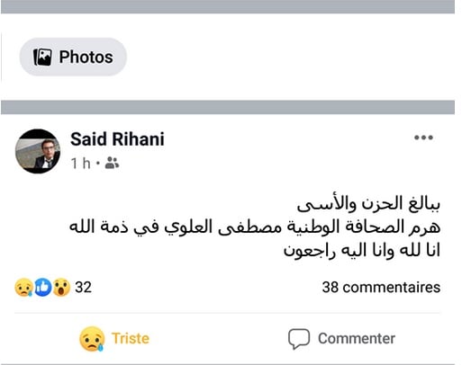 ونعى سعيد الريحاني، رئيس تحرير جريدة الأسبوع، الراحل بتدوينة جاء فيها "ببالغ الحزن والأسى هرم الصحافة الوطنية مصطفى العلوي في ذمة الله.انا لله وانا اليه راجعون".