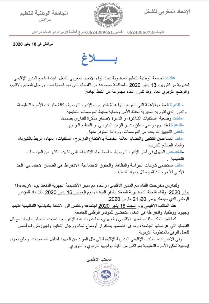 البلاغ تعرض كذلك لاجتماع المكتب الإقليمي يوم السبت الأخير، والذي خلص الى الاشادة بالدينامية التنظيمية اقليميا وجهويا ووطنيا، وعبر عن انخراطه في اشغال التحضير للمؤتمر الوطني للجامعة، كما ثمن لقاء المدير الاقليمي والجهوي الأخيرين، وما عبرت الإدارة عنه خلالهما من استعداد للتجاوب ايجابا مع كل القضايا التي عرضتها الجامعة، واهتمامها باستقرار أوضاع نساء ورجال التعليم، وتهيئ ظروف أحسن للعمل للرقي بالمنظومة التربوية. ودعا المكتب المديرية الإقليمية إلى بذل المزيد من الجهود لتذليل الصعوبات، وخلق أجواء إيجابية تمكن الأسرة التعليمية بمراكش من القيام بواجبها التربوي والتنويري.