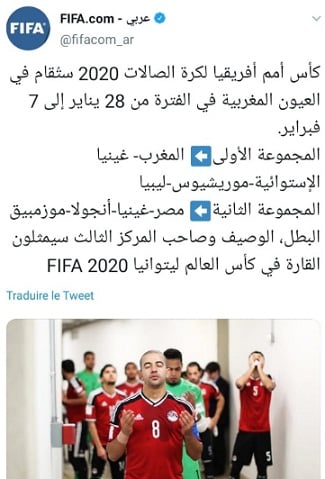 وجاء في تغريدة الفيفا:"كأس أمم أفريقيا لكرة الصالات 2020 ستُقام في العيون المغربية في الفترة من 28 يناير إلى 7 فبراير.