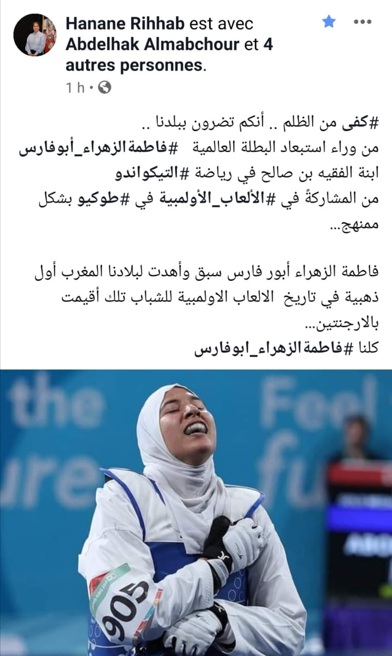 مناسبة هذا التقديم، هو الجدل الكبير الذي أعقب استبعاد البطلة المغربية "فاطمة الزهراء أبو فارس"، من لائحة الفريق الوطني الذي سيشارك في الإقصائيات المؤهلة لأولمبياد "طوكيو" التي ستنظم بالعاصمة الرباط، لأسباب قالت جامعة الهلالي أنها مرتبطة بوضعها الصحي، دون أن يستند هذا "الحرمان" بحسب مصادر مطلعة جدا لأي تقرير طبي رسمي، على اعتبار أن الجامعة المذكورة لا تتوفر على "لجنة طبية"، الأمر الذي دفع العديد من المهتمين إلى التساؤل عن هوية الجهة التي أصدرت هذا القرار الذي وصف بـ "الجائر"، سيما أن البطلة "أبو فارس" ظلت تستعد لهذا الحدث بفرنسا، لمدة شهرين متواصلين، وعينها على ذهبية "طوكيو".