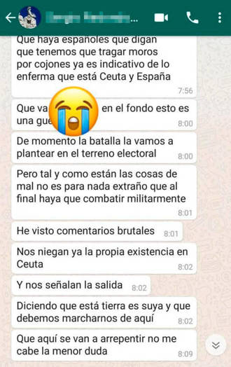 هذا، وقام المستشاران بنشر محادثات من تطبيق الواتساب للمجموعة الخاصة بأعضاء الحزب، تعتبر عن عنصرية كبيرة تجاه المغاربة وتدعو لقتالهم، حيث اعتبر أحد الأعضاء أنه ربما يأتي يوم يعتبر فيه المغاربة المقيمين بسبتة، السلطات الاسبانية، بمثابة الاحتلال الاسرائيلي لفلسطين، حسب تعبيره.