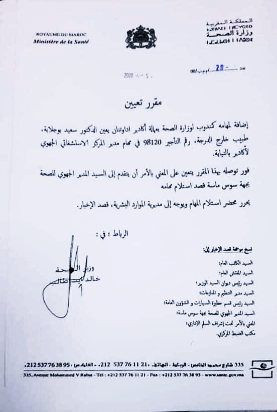 وفي مقابل ذلك، عين وزير الصحة، مندوب وزارته بعمالة أكادير إداوتنان، الدكتور "سعيد بوجلابة" مديرا بالنيابة للمركز الاستشفائي الجهوي "الحسن الثاني" بأكادير، في انتظار تعيين مدير جديد.