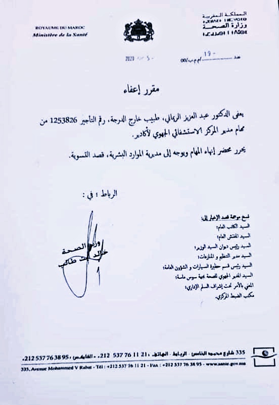 عقب مضي شهر على حلول لجان تفتيش خاصة، بالمركز الاستشفائي الجهوي "الحسن الثاني" بمدينة أكادير، بهدف فتح تحقيقات تهم تدبير هذا المرفق العمومي، أصدر وزير الصحة، البيجيدي "خالد آيت الطالب"، أمس الأربعاء، قرارا يقضي بإعفاء الدكتور "عبد العزيز الريماني"، المنتمي لحزب "التقدم والاشتراكية"، من مهامه كمدير لمستشفى الحسن الثاني.