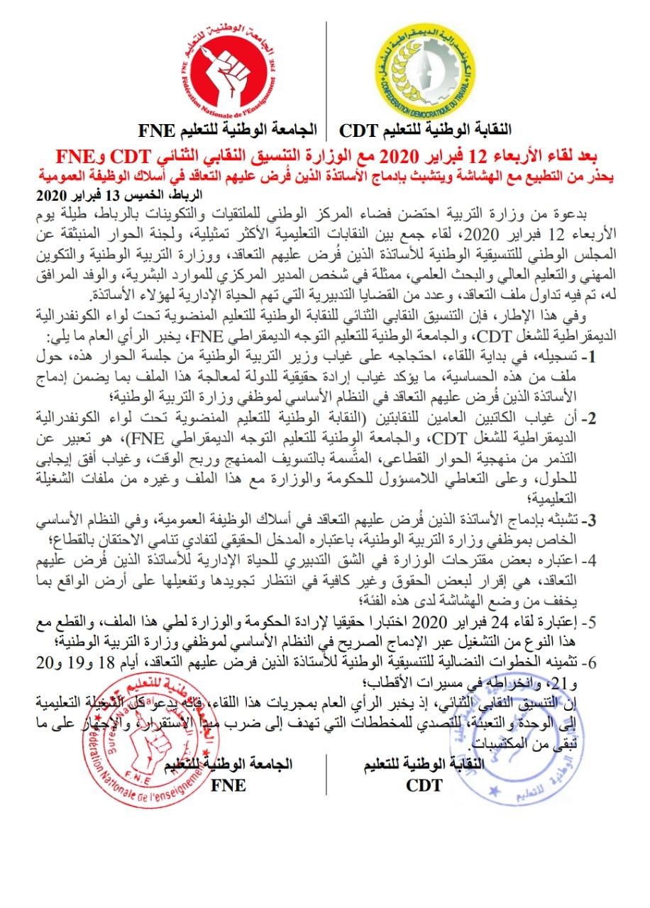 مباشرة بعد لقائها أمس الأربعاء، 12 فبراير 2020، مع وزارة التربية الوطنية، بادر التنسيق النقابي الثنائي CDT وFNE لإصدار بيان صباح اليوم الخميس، توصلت أخبارنا بنسخة منه، يحذر من خلاله مما وصفه بالتطبيع مع الهشاشة ويعلن تشبثه بإدماج الأساتذة الذين فُرض عليهم التعاقد في أسلاك الوظيفة العمومية.