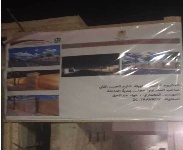 تشرف الجماعة الترابية للداخلة، على مشروع تهيئة شارع الحسن الثاني بوسط مدينة الداخلة، وهو المشروع الذي ينقصه بطاقة تقنية واضحة بها جميع تفاصيل المشروع، وهو ما تفتقده البطاقة التقنية لهذا المشروع الذي يثير عدة تساؤلات.