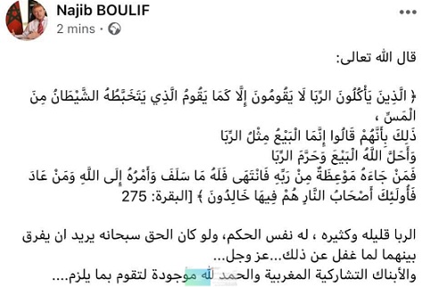 بوليف كتب بأسلوب إفتائِيٍّ: "الربا قليله وكثيره، له نفس الحكم، ولو كان الحق سبحانه يريد أن يفرق بينهما لما غفل عن ذلك...عز وجل... والأبناك التشاركية المغربية والحمد لله موجودة لتقوم بما يلزم..."، ليرفقها بآيات من القرآن الكريم.