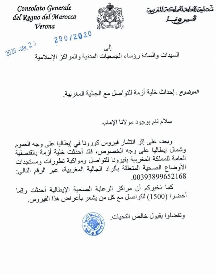 أحدثت القنصلية المغربية بمدينة فيرونا، خلية أزمة للتواصل مع المغاربة القاطنين بإيطاليا على خلفية انتشار فيروس كورونا بشكل مثير للقلق.