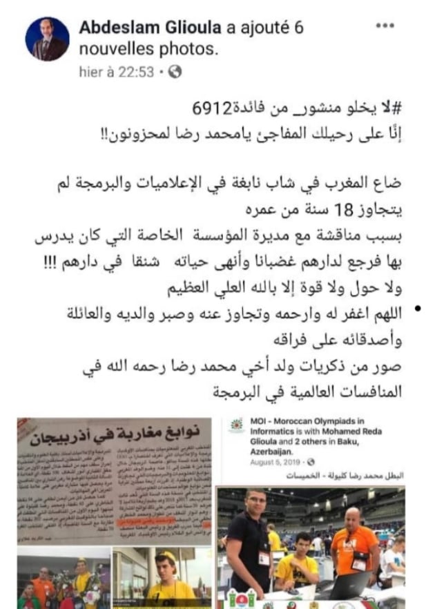 وتابع عم الشاب الراحل والقاطن بكندا "اللهم اغفر له وارحمه وتجاوز عنه وصبر والديه والعائلة وأصدقائه على فراقه"، واضعا صورا من ذكريات ابن أخيه في المنافسات العالمية في البرمجة.
