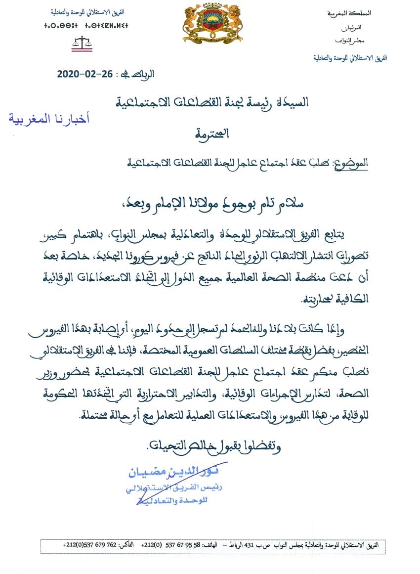 وطلب "نور الدين مضيان" رئيس الفريق المذكور في مراسلته، رئيسة لجنة القطاعات الإجتماعية بضرورة عقد اجتماع طارئ، لتدارس الاجراءات الوقائية والتدابير الاحترازية التي اتخذتها الحكومة للوقاية من فيروس كورونا.