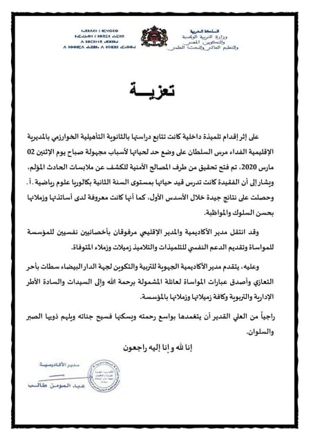 وفي سياق متصل، قدم سعيد أمزازي وزير التربية الوطنية تعازيه أصالة عن نفسه، و نيابة عن كافة الأطر التربوية لعائلة الفقيدة، وأساتذتها وزملاءها من التلاميذ والتلميذات.