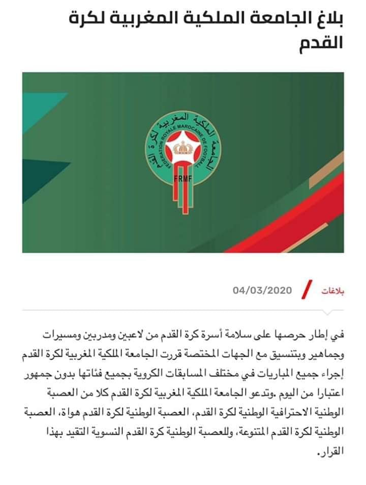 وذكر بلاغ للجامعة الملكية المغربية لكرة القدم أنها "في إطار حرصها على سلامة أسرة كرة القدم من لاعبين ومدربين ومسيرين وجماهير، وبتنسيق مع الجهات المختصة، قررت إجراء جميع المسابقات الكروية بجميع فئاتها من دون جمهور".